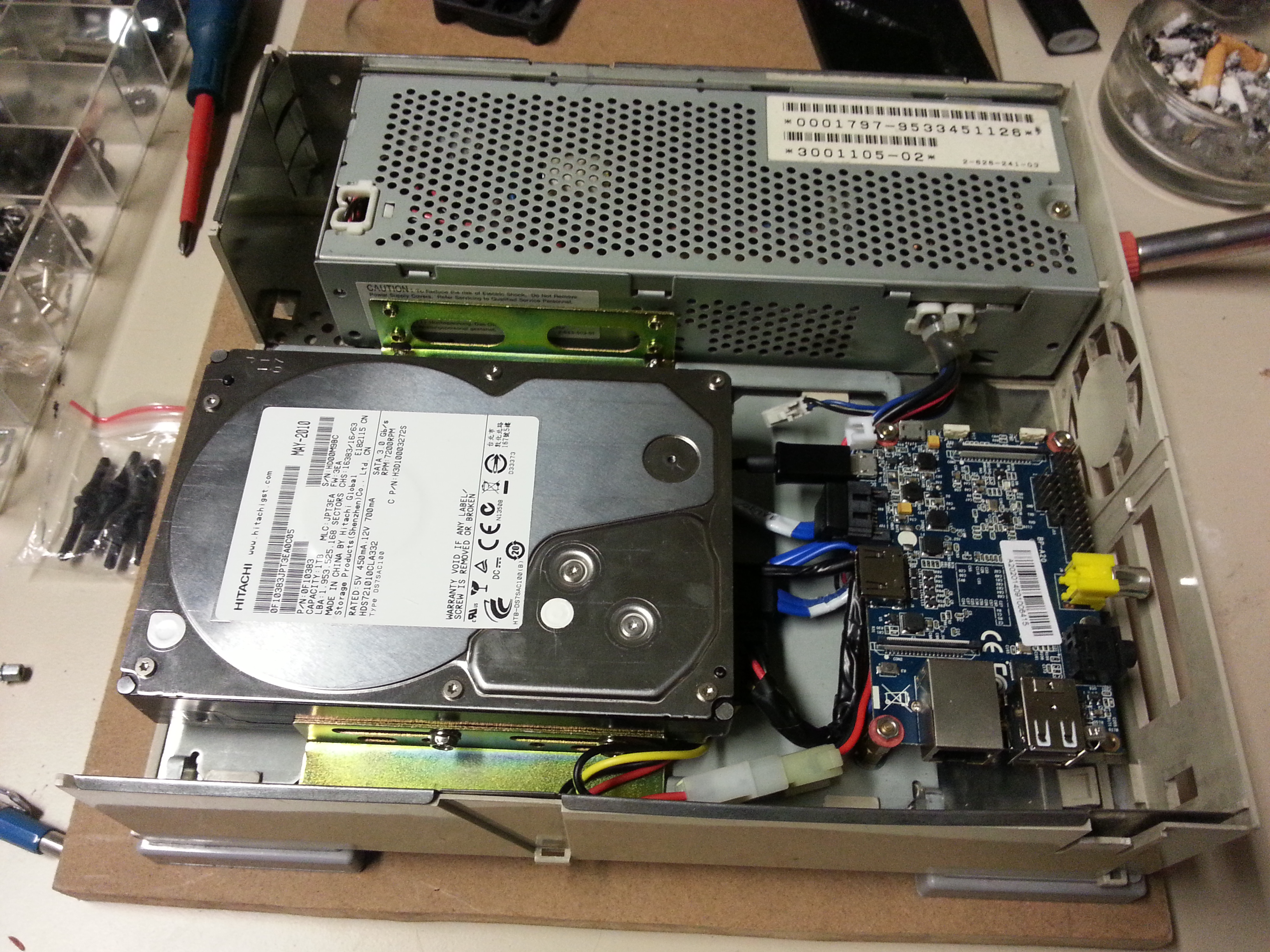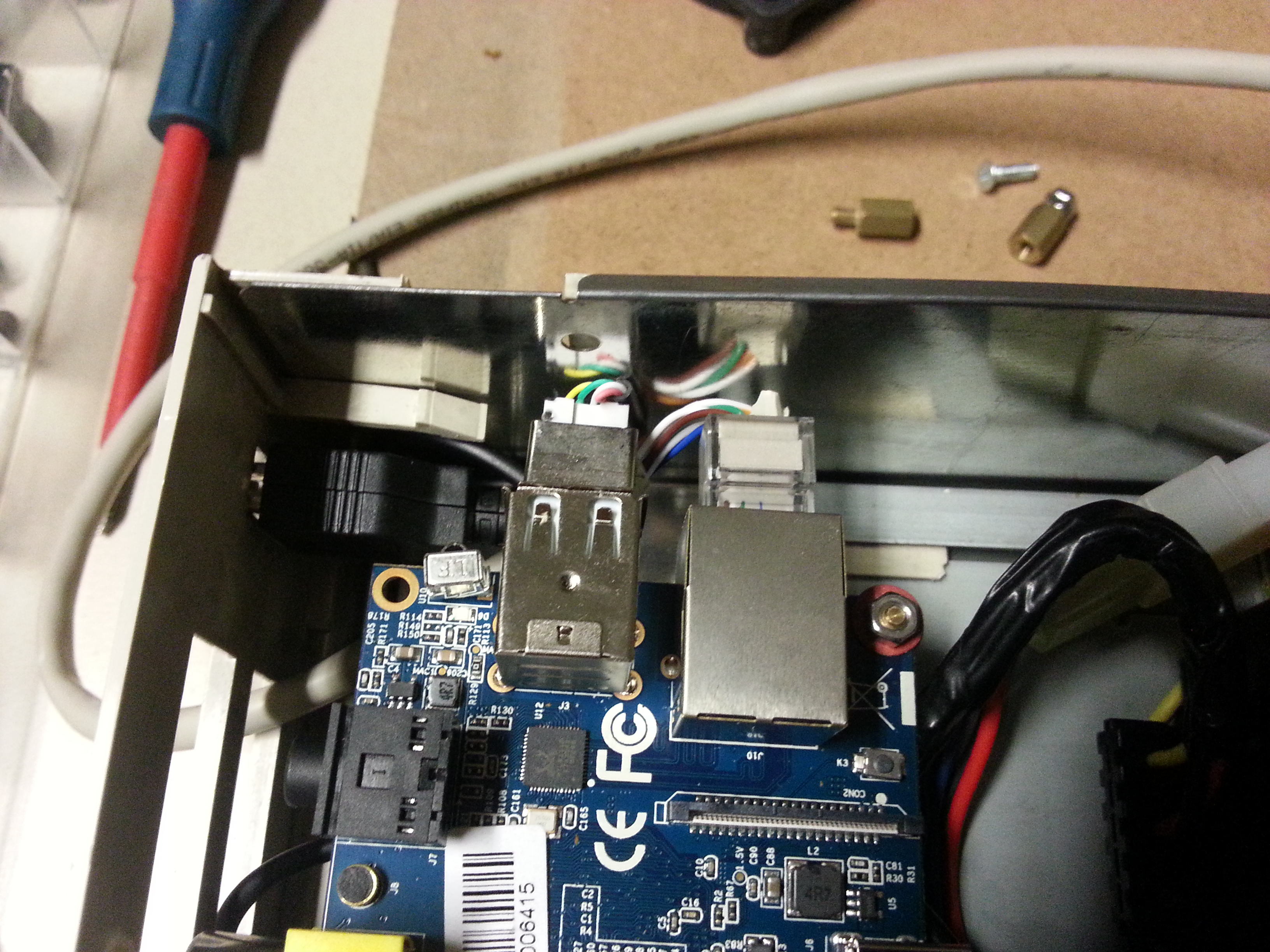 Der Zusammenbau war Formsache: Festplatte rein, BPi auf die Bolzen, alles verschraubt und verkabelt. Fast fertig – aber Mist! Netzwerkkabel und USB-Kabel vergessen.